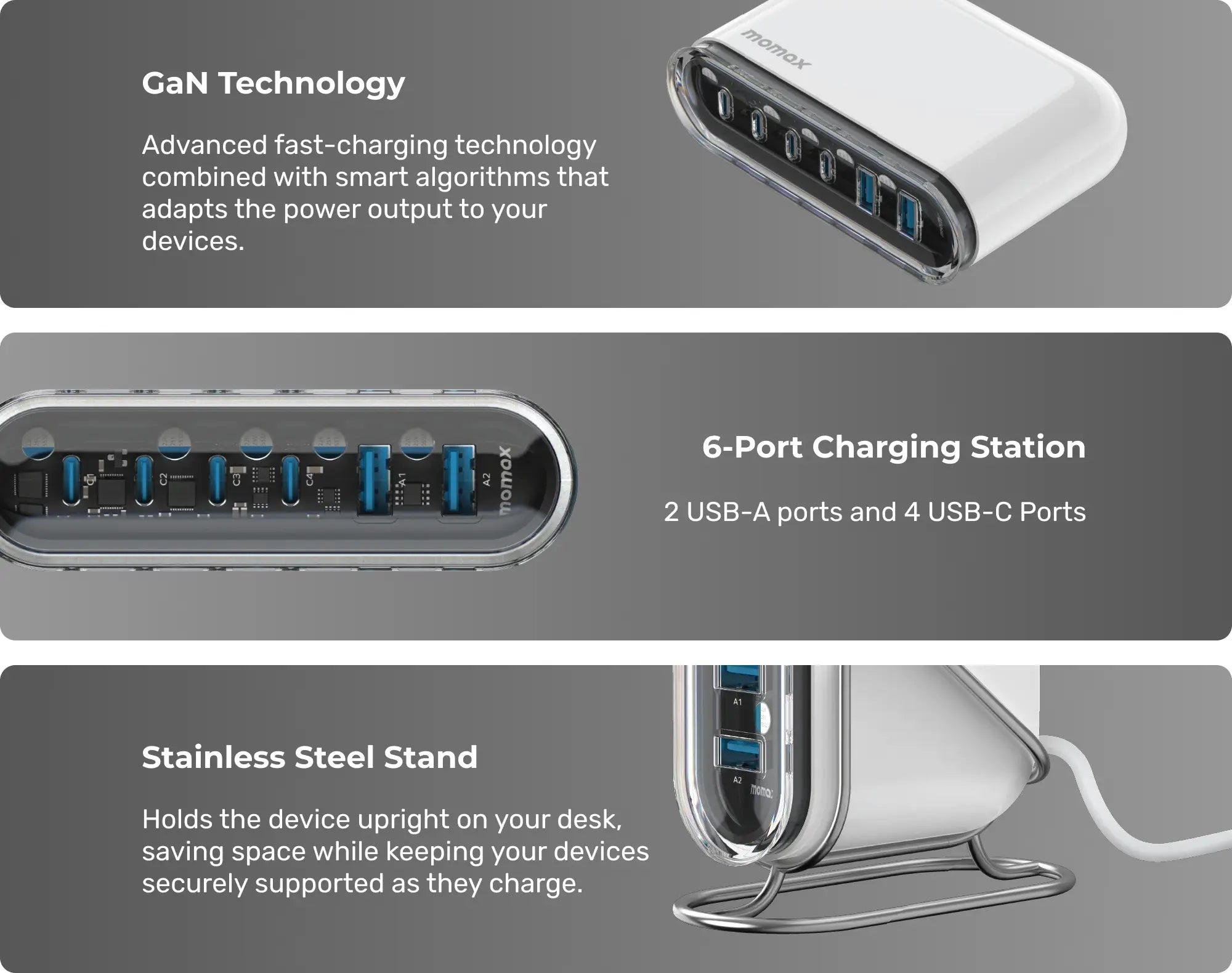 This sleek, compact charging station keeps your desk free of tangled cords and unsightly plugs.